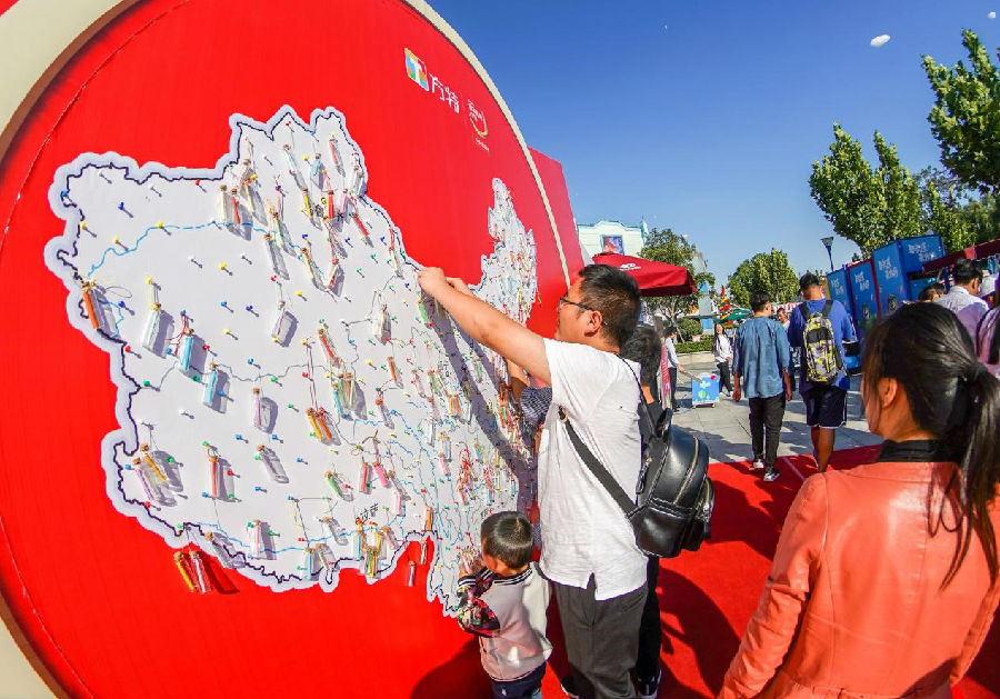 ▲游客在方特主題樂園前的地圖上留下對祖國的祝福