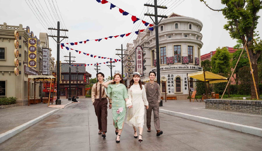 從刷著“十萬工農下吉安”紅軍宣傳標語的瑞金街,到設有“東商洋貨”和“寶麗唱片行”的“十里洋場”上海街,方特東方欲曉通過大量的仿古建筑、布景,打造了多個還原近現代中國不同時期的社會風貌和人文風情的主題街區、小鎮,營造重回歷史的氛圍。