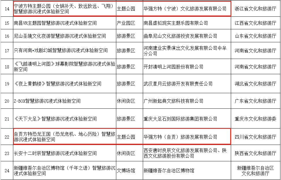 近日,文化和旅游部(下稱“文旅部”)公布全國智慧旅游沉浸式體驗新空間首批24家培育試點項目名單,自貢方特的《恐龍危機》《地心歷險》與寧波方特的《女媧補天》《致遠 致遠》《飛翔》光榮上榜。