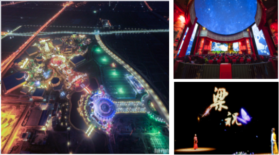 左-寧波方特東方神畫夜景,右上-全景式動(dòng)態(tài)球幕項(xiàng)目《牛郎織女》,右下-全息AR劇場(chǎng)《千古蝶戀》