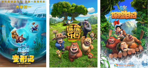 左-動(dòng)畫電影《熊出沒?變形記》,中-動(dòng)畫片《熊熊樂園》,右-動(dòng)畫片《熊出沒之探險(xiǎn)日記》