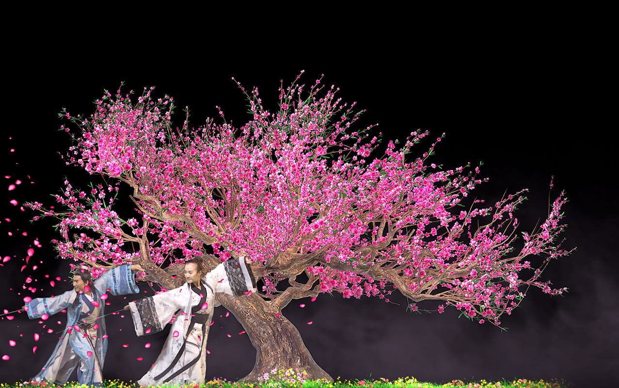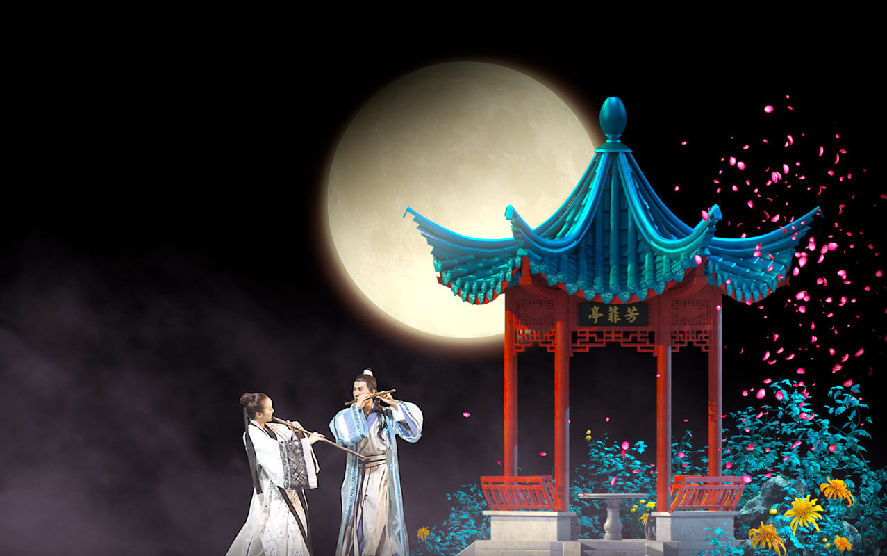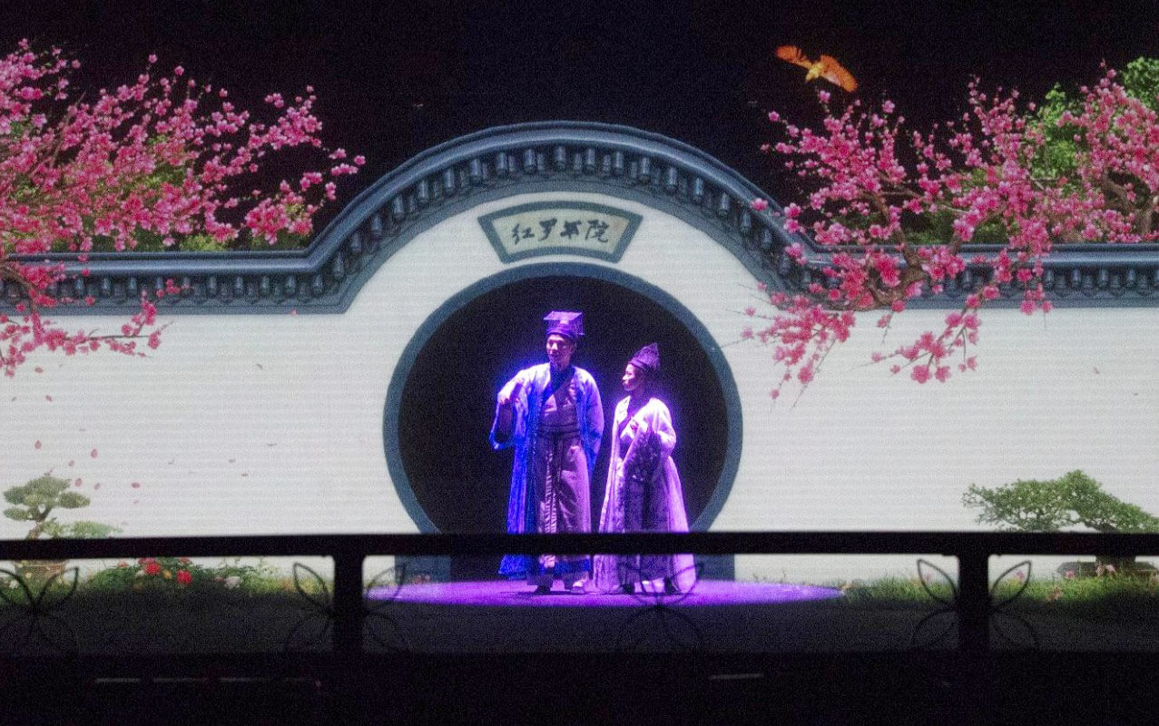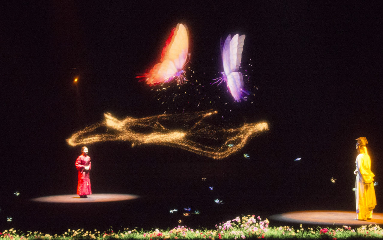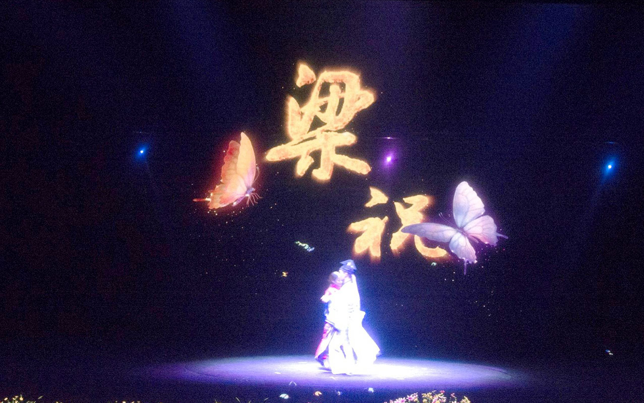 全景式AR環境影片《梁祝》,打破傳統歌舞劇場的表演形式,把真人表演與幻影成像相結合。以《梁山伯與祝英臺》的愛情故事為基礎,精彩演繹祝英臺女扮男裝上山求學,與梁山伯暗生情愫,最后為追尋真愛而殉情,兩人雙雙化蝶的經典橋段 。實現了四面墻在通透的舞臺上憑空出現,藤蔓在墻上生長,以及墻面碎裂、崩塌甚至消失等神奇效果。