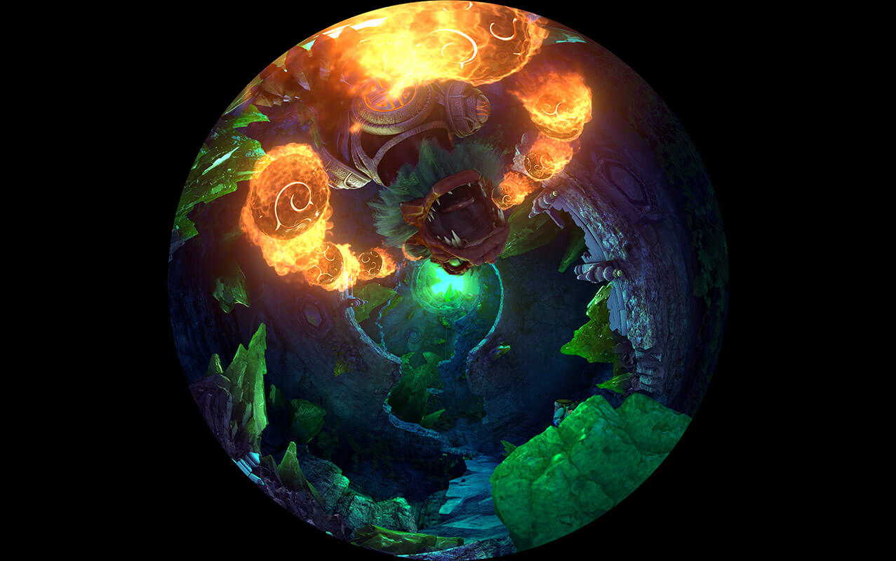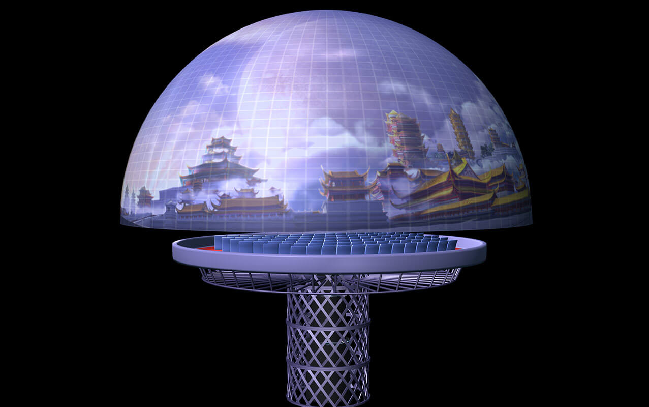 室內(nèi)升降式穹頂影院主演廳分為兩層,通過大型旋轉(zhuǎn)升降式平臺(tái)連接。一層為多媒體實(shí)景舞臺(tái),多種銀幕與實(shí)景相結(jié)合,二層為穹頂式球幕表演。根據(jù)劇情發(fā)展帶領(lǐng)觀眾乘坐超大型提升平臺(tái)從一層提升到9米高的二層觀影平臺(tái),結(jié)合多種高科技表現(xiàn)手段,創(chuàng)造出震撼的動(dòng)感體驗(yàn)。
